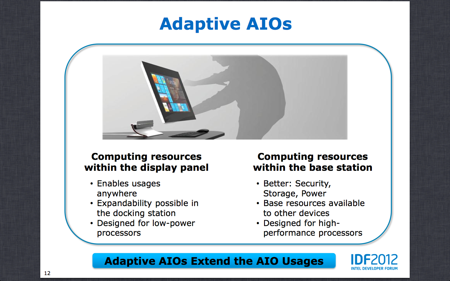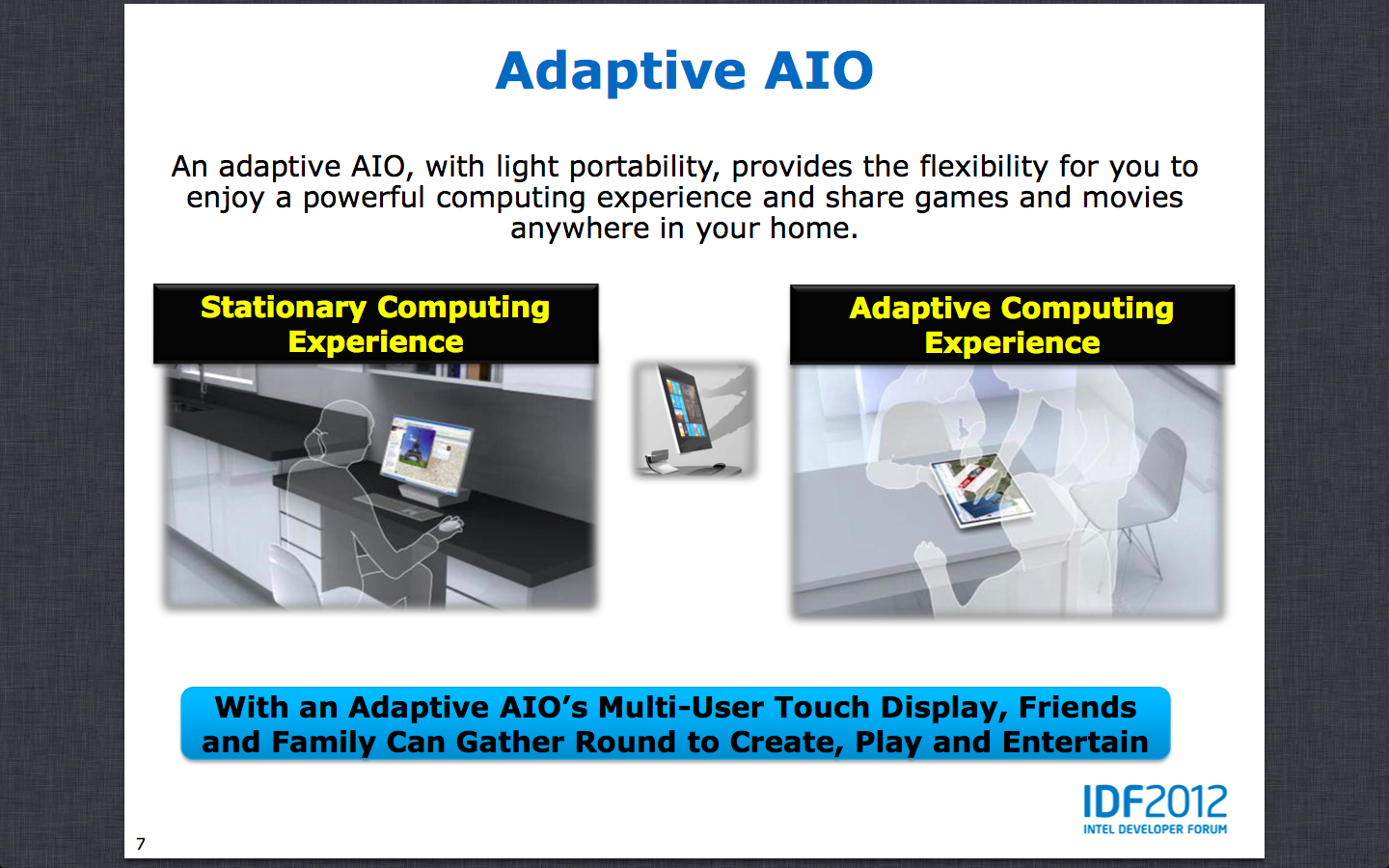 Als voorbeeld van een adaptive all-in-one noemde Kirk Skaugen, vice-president en general manager van de pc client-divisie van Intel, de Sony Vaio Tap 20. In de toekomst zullen de adaptive all-in-ones groter worden, verwacht het chipbedrijf. Het liet een prototype zien van een 27"-al-in-one met eem dikte van 6cm, die rondgedragen kon worden en op een docking station bevestigd kon worden. Het scherm had een resolutie van 1920x1080.