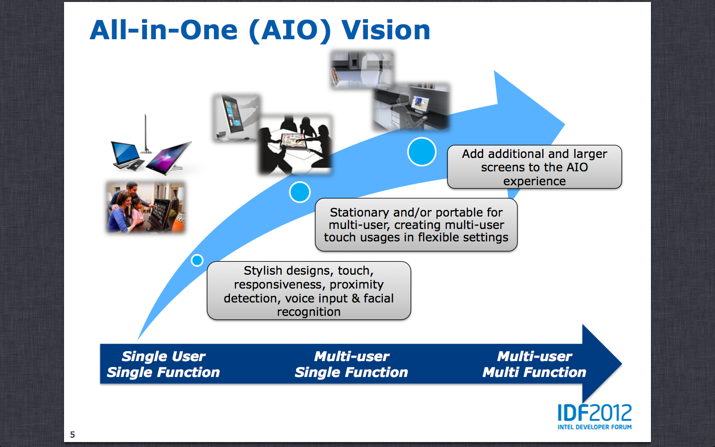 Intel voorziet dat de all-in-one snel in populariteit zal toenemen, mede door de komst van Windows 8. De meest all-in-ones hebben nu nog een vaste plek op een kamer, maar de visie van het chipbedrijf is dat daar mobiel gebruik bij komt. Door een all-in-one met touchscreen bijvoorbeeld op een tafel te leggen kunnen gebruikers samen gamen of content creëren. Intel denkt daarbij aan bijvoorbeeld virtuele bordspellen en audio-applicaties als dj-software, maar ook verwacht Intel dat de aio's gebruikt gaan worden voor educatieve en zakelijke doeleinden.