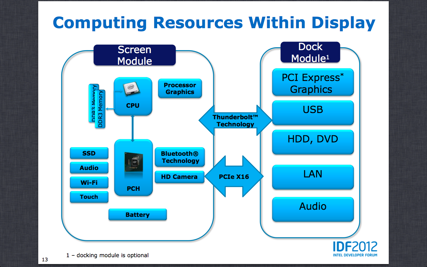 Optioneel gaan de adaptive all-in-ones gecombineerd worden met docking stations. Die moeten dan met een discrete gpu voor meer grafische rekenkracht zorgen, meer opslagcapaciteit bieden en meer verbindingsmogelijkheden binnen handbereik brengen, zoals ethernettoegang. De verbinding met de dock zou via Intels eigen Thunderbolt moeten verlopen.