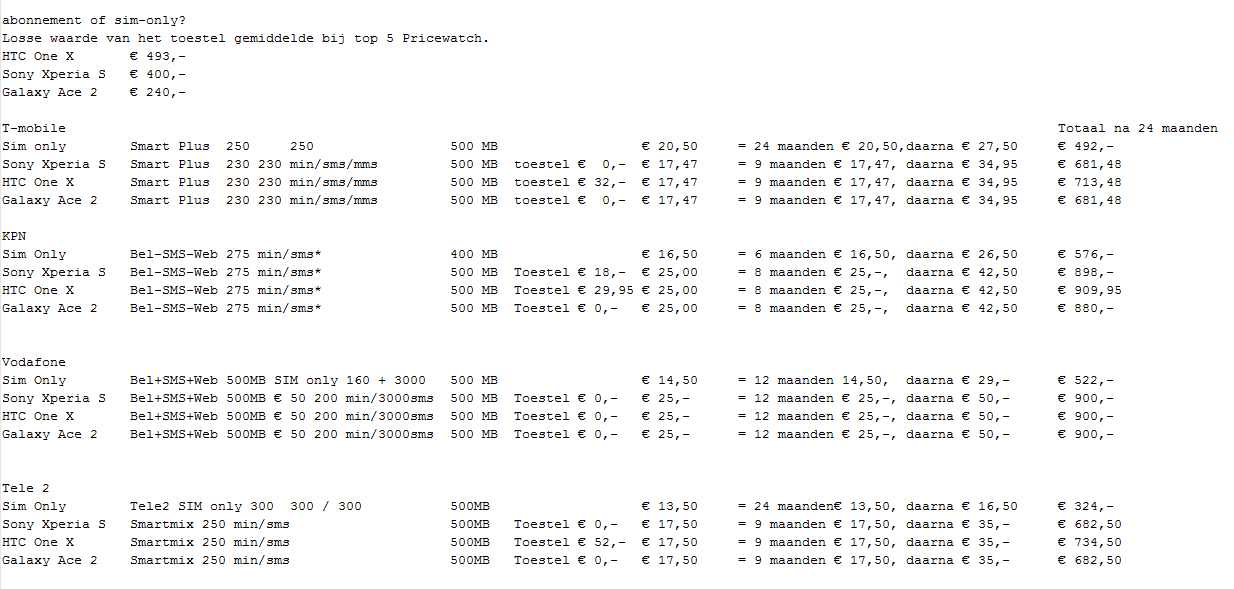Van de onderzochte toestellen is alleen de Samsung Galaxy S III bij alle providers en alle abonnementen beschikbaar. Daaruit blijkt de telefoon bij Tele2 zowel met abonnement als in een sim-only met los toestel het goedkoopste, rond 800 euro. Hetzelfde toestel kost bij T-Mobiles iSmart 150 bijna 1200 euro.