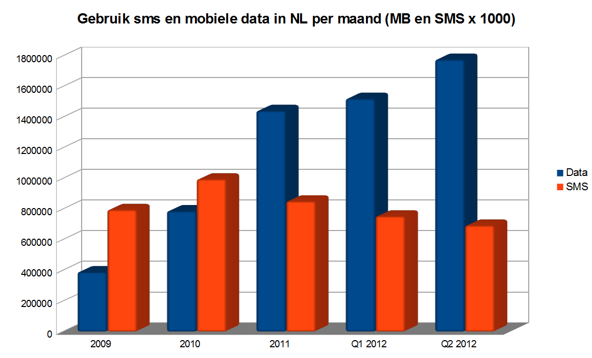 De herinvoering van strikte datalimieten afgelopen jaren heeft geen grote invloed gehad op de groei van het dataverbruik: waar de stijging per jaar in 2010 per jaar 100 procent was, is dat inmiddels gedaald tot ongeveer 80 procent; in de lente van 2012 werd 80 procent meer data verstookt dan in de lente van 2011. Een deel van die stijging is te verklaren uit het gestegen aantal mobiele internetters. Dat aantal aansluitingen steeg met ongeveer eenderde van 6,7 miljoen in het voorjaar van 2011 naar 8,9 miljoen in 2012. Elke maand komen er nog ongeveer 130.000 aansluitingen voor mobiel internet bij; daaronder zijn niet alleen smartphones, maar ook 3g-abonnementen voor bijvoorbeeld tablets.