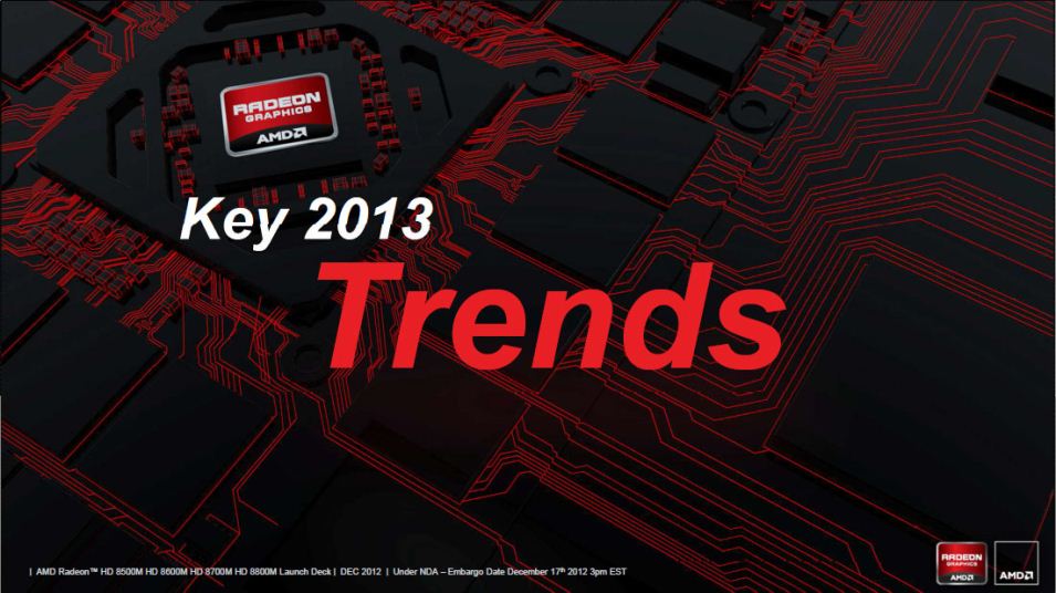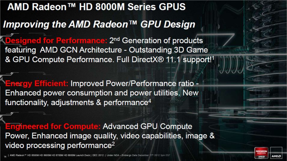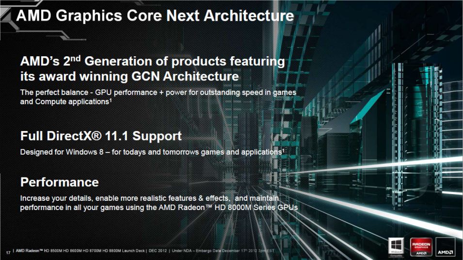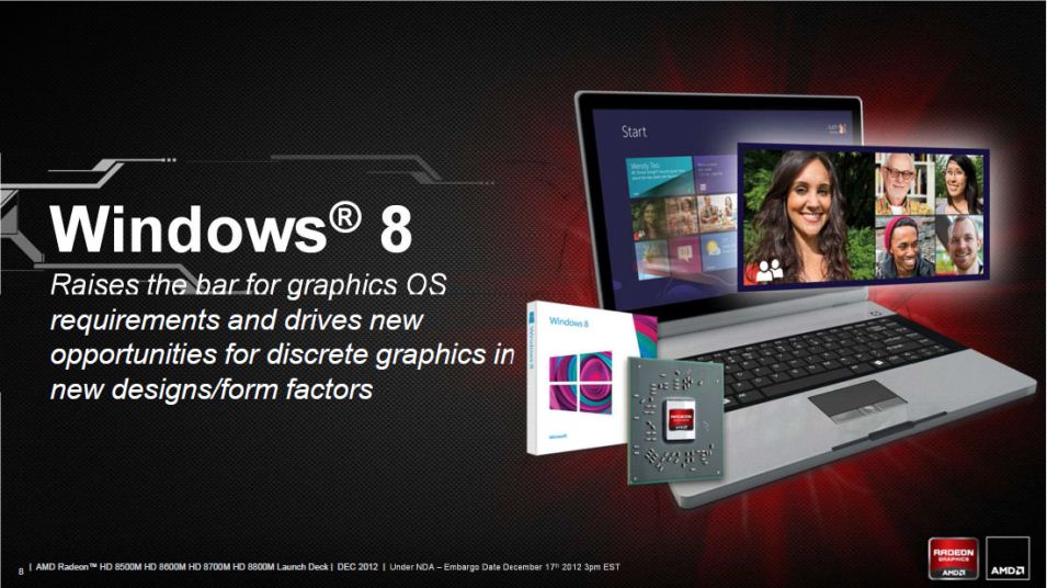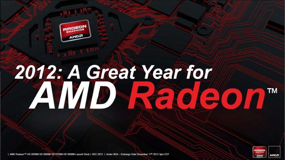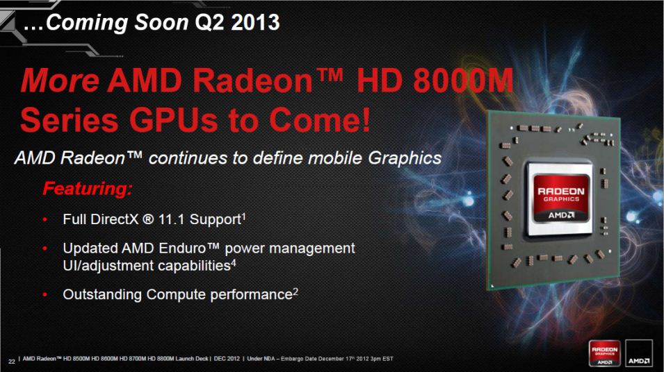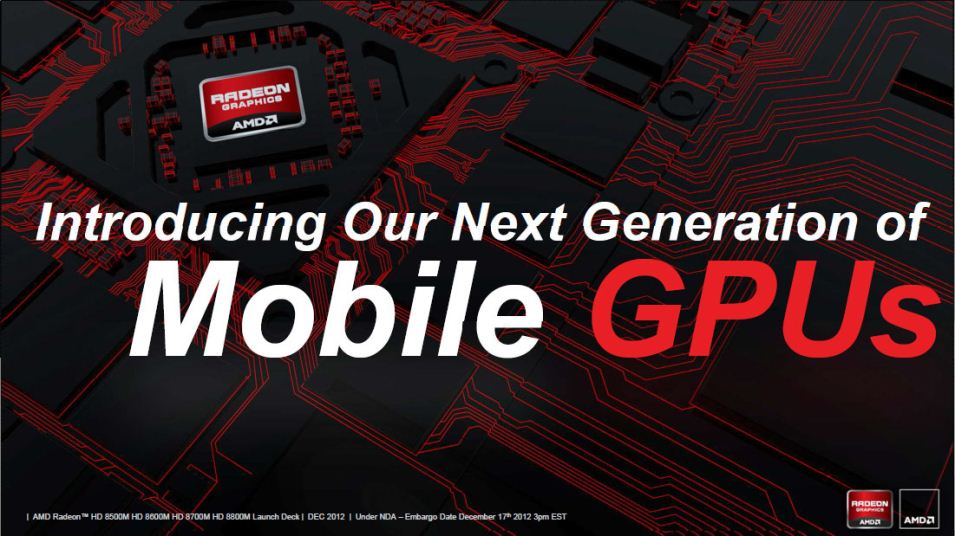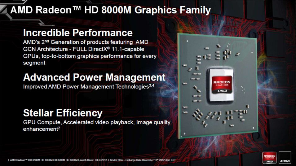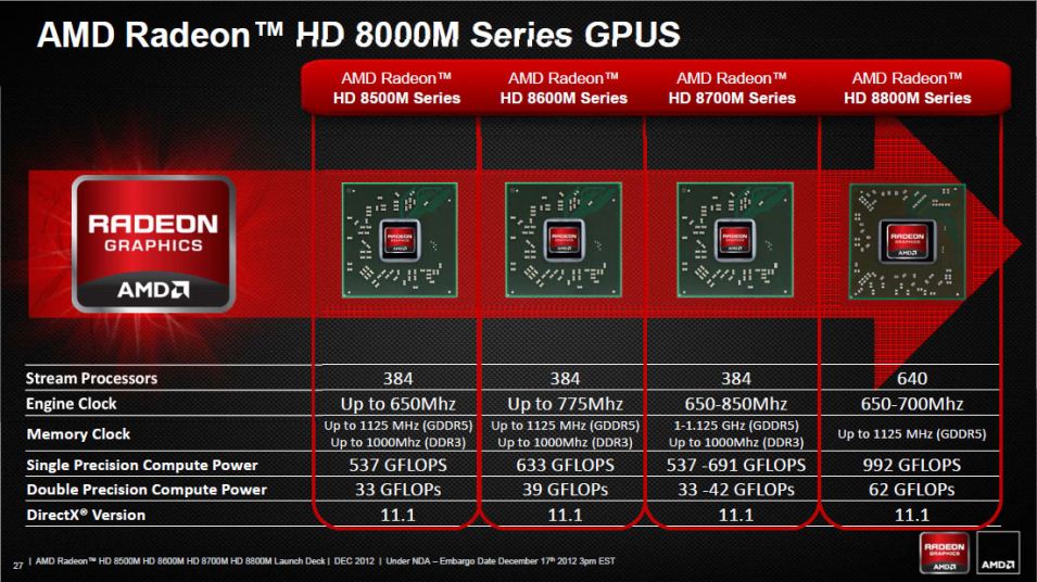 AMD heeft de 8000M-serie aangekondigd: de nieuwe lijn gpu's bestemd voor instap- en mainstreamlaptops. De gpu's zijn gebaseerd op de GCN-architectuur, met maximaal 640 streamprocessors. De high-end chips zouden pas in het tweede kwartaal van 2013 komen.