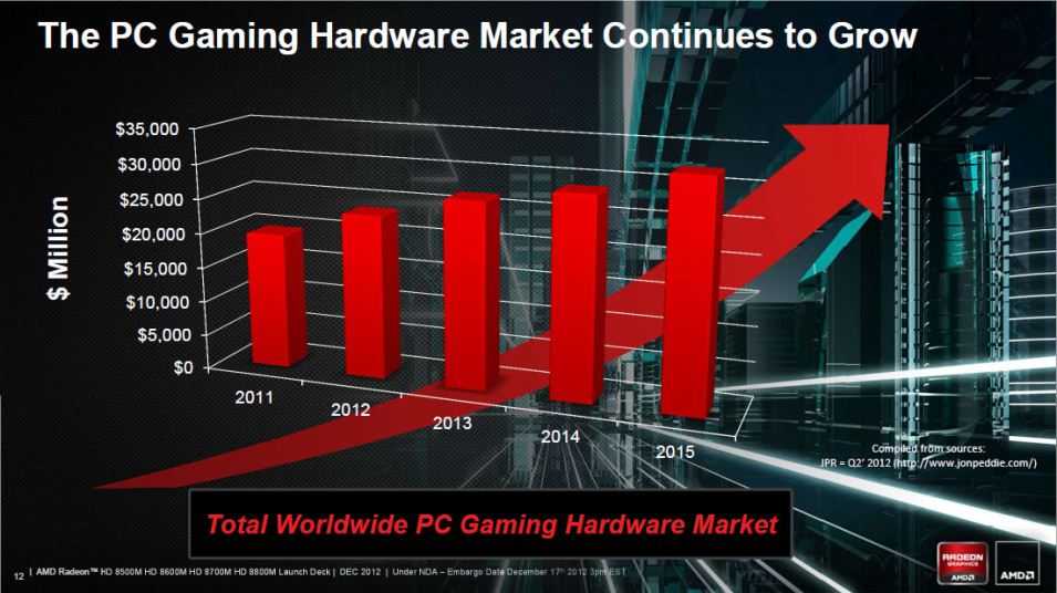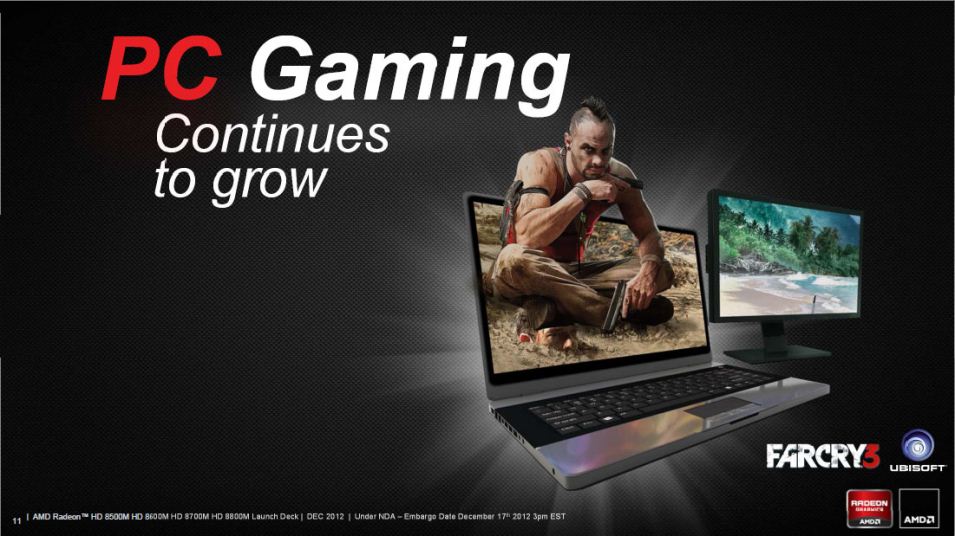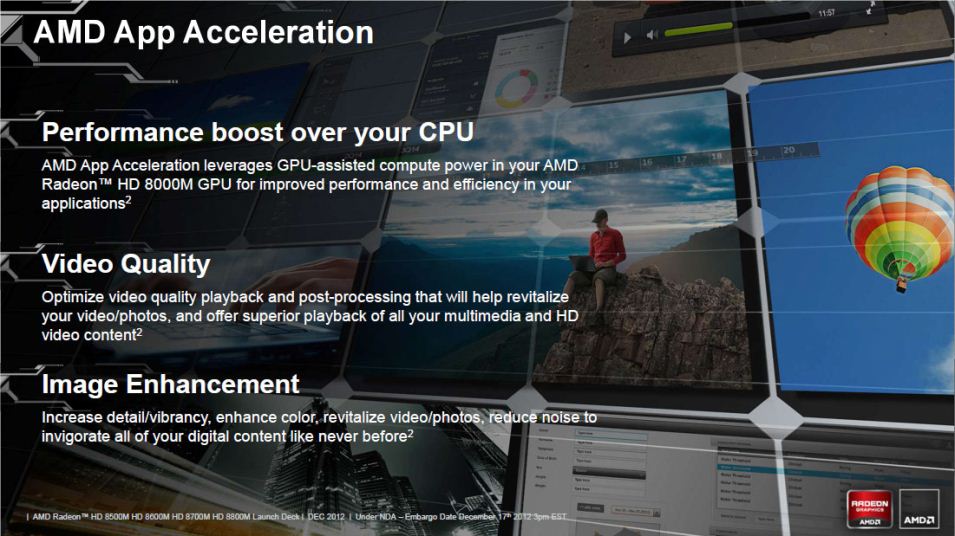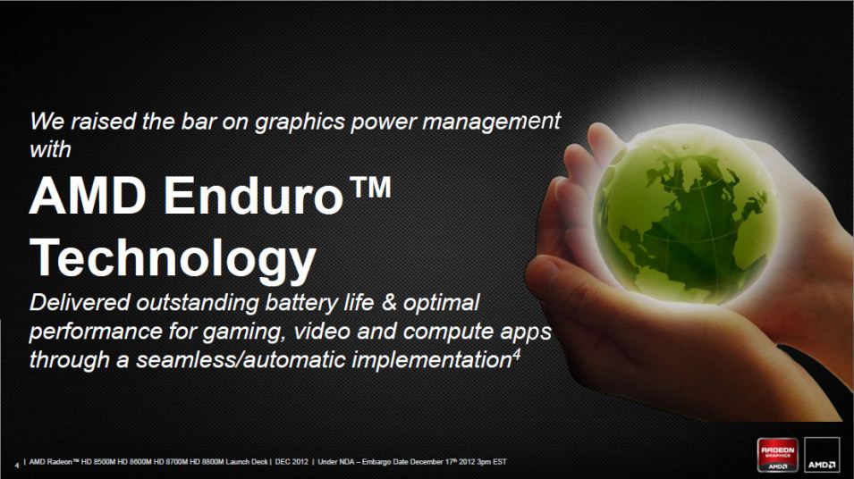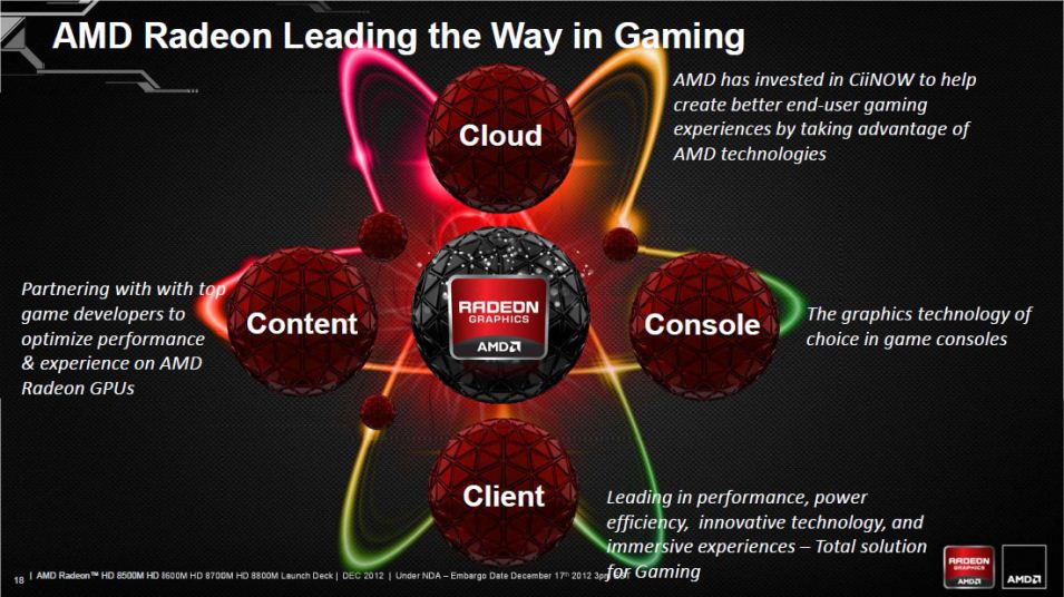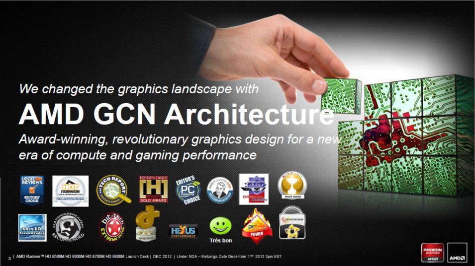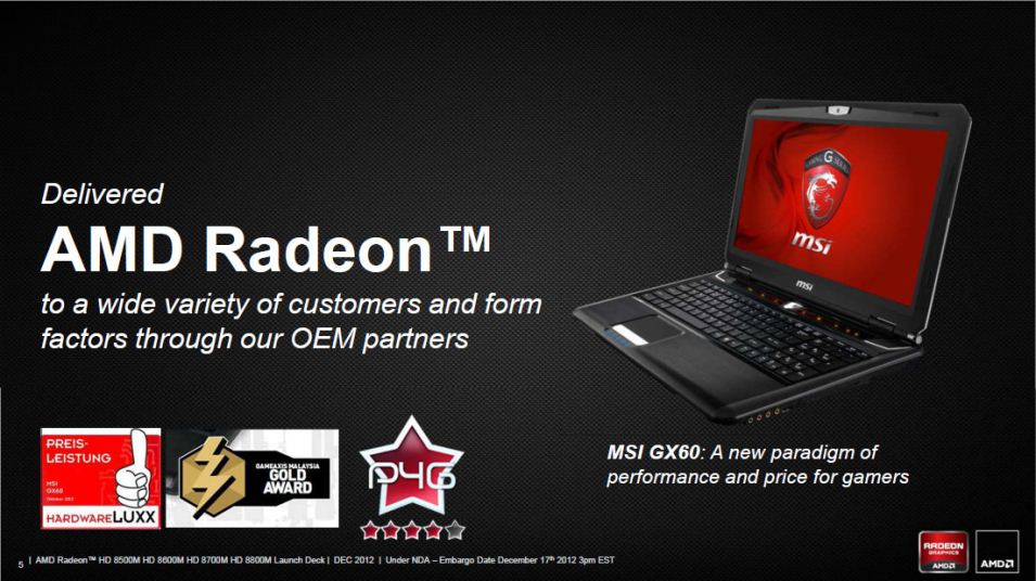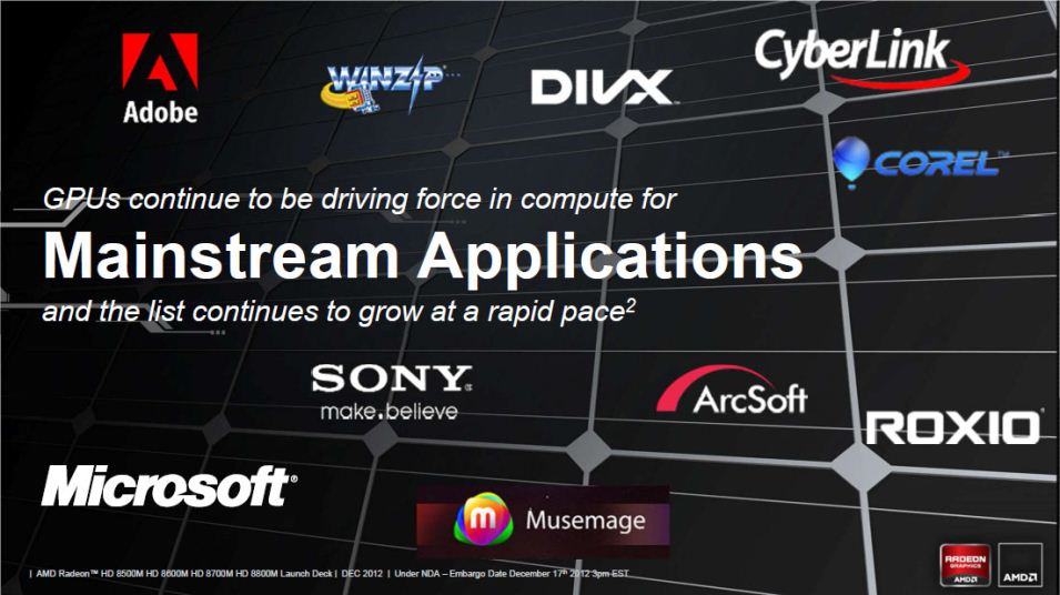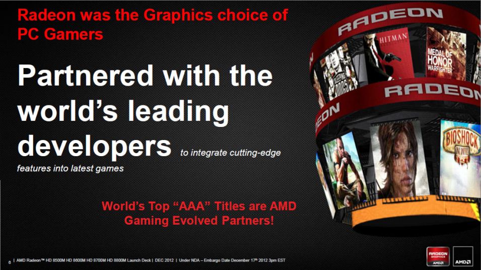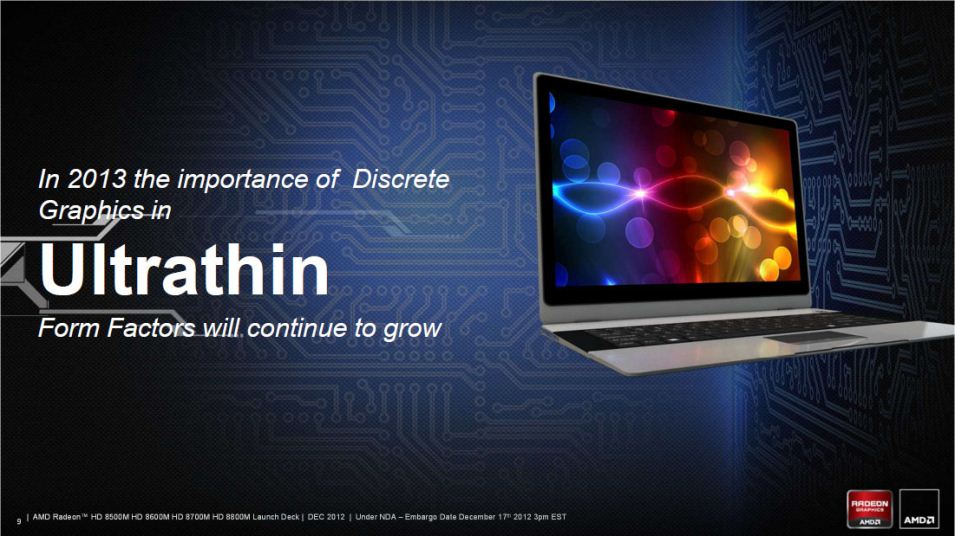 AMD heeft de 8000M-serie aangekondigd: de nieuwe lijn gpu's bestemd voor instap- en mainstreamlaptops. De gpu's zijn gebaseerd op de GCN-architectuur, met maximaal 640 streamprocessors. De high-end chips zouden pas in het tweede kwartaal van 2013 komen.