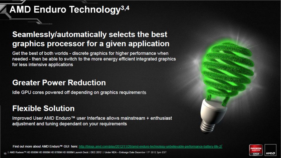 De prestaties van de chips zullen weinig baanbrekend zijn, maar het werd wel tijd dat AMD zijn goedkopere laptop-gpu's een update gaf. De nieuwe chips worden namelijk op 28nm gebakken, terwijl bijvoorbeeld de HD 7670M, die nu vervangen wordt door de HD 8770M, nog op 40nm werd geproduceerd. Daardoor zal het energieverbruik afnemen, maar AMD voorzag de gpu's ook van enkele nieuwe functies, zoals Enduro, waarmee naadloos tussen twee gpu's gewisseld kan worden. De prestaties nemen overigens wel toe, omdat de GCN-architectuur maar liefst twee generaties nieuwer is dan de vliw5-architectuur die voor de HD 7670M gebruikt werd.