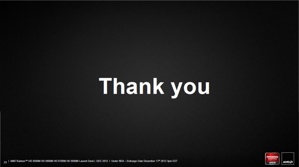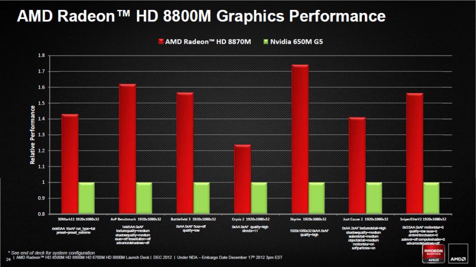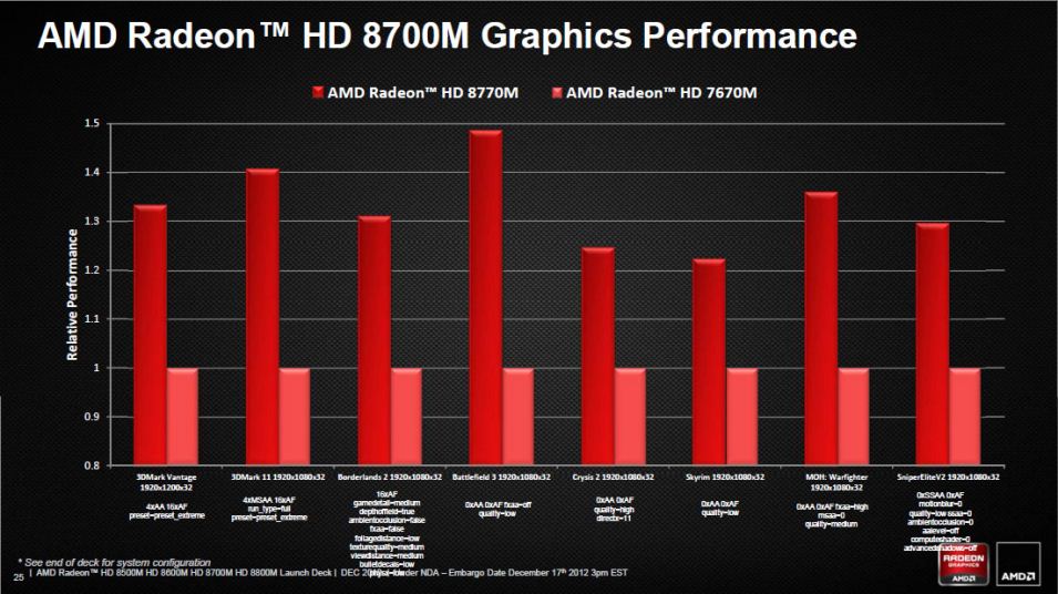 Volgens AMD zou de HD 8870M tot wel 50 procent sneller zijn dan Nvidia's GT 650M. Hoe de nieuwe videokaarten zich verhouden tot Nvidia's snellere gpu's, zoals de GTX 670M of GTX 675M, maakte AMD niet bekend. Wel meldt AMD dat er in het tweede kwartaal van 2013 nieuwe mobiele gpu's uitkomen, die de HD 7800M- en HD 7900M-serie zullen vervangen. Of dit rebrands zijn is niet duidelijk, aangezien de huidige 7800M- en 7900M-serie al gebruik maken van de GCN-architectuur en op 28nm worden geproduceerd.