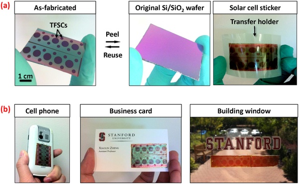 Onderzoekers zijn erin geslaagd om zonnecel-stickers te maken, die vervolgens op visite-kaartjes of mobiele telefoons geplakt kunnen worden. De zonnecellen worden op normale wijze geproduceerd, maar worden vervolgens van de silicium-ondergrond afgehaald.