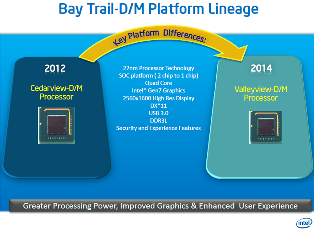 Bay Trail zou Cedar Trail in 2014 opvolgen, en de stap maken naar een soc met de chipset en processor die op één plak silicium zijn geïntegreerd. De soc, met codenaam Valleyview, zou bestaan uit maximaal vier processorkernen en een zevende generatie gpu, die op 22nm met zogeheten trigate-transistors geproduceerd worden. De cpu kan, anders dan de huidige Atoms, instructies out-of-order verwerken, wat een snelheidswinst van 50 tot 100 procent moet opleveren. Ook de gpu zou flink aangepakt zijn en tot driemaal sneller zijn dan de voorgaande generatie Atom-gpu's. Bovendien moet de gpu hoge resoluties tot 2560x1600 pixels ondersteunen en compatibel zijn met DirectX 11.
