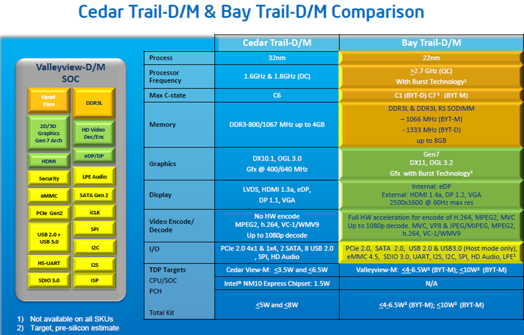 Bay Trail-M en Bay Trail-D voor respectievelijk eenvoudige notebooks en desktops hebben wel aansluitingen voor sata-apparaten en pci-express-hardware. Bay Trail-M krijgt een tdp van 6,5W, terwijl Bay Trail-D met een tdp van 12W het minst zuinig zou worden. Fabrikanten zouden rond deze zomer de eerste engineering samples krijgen, ter voorbereiding op een introductie begin 2014.