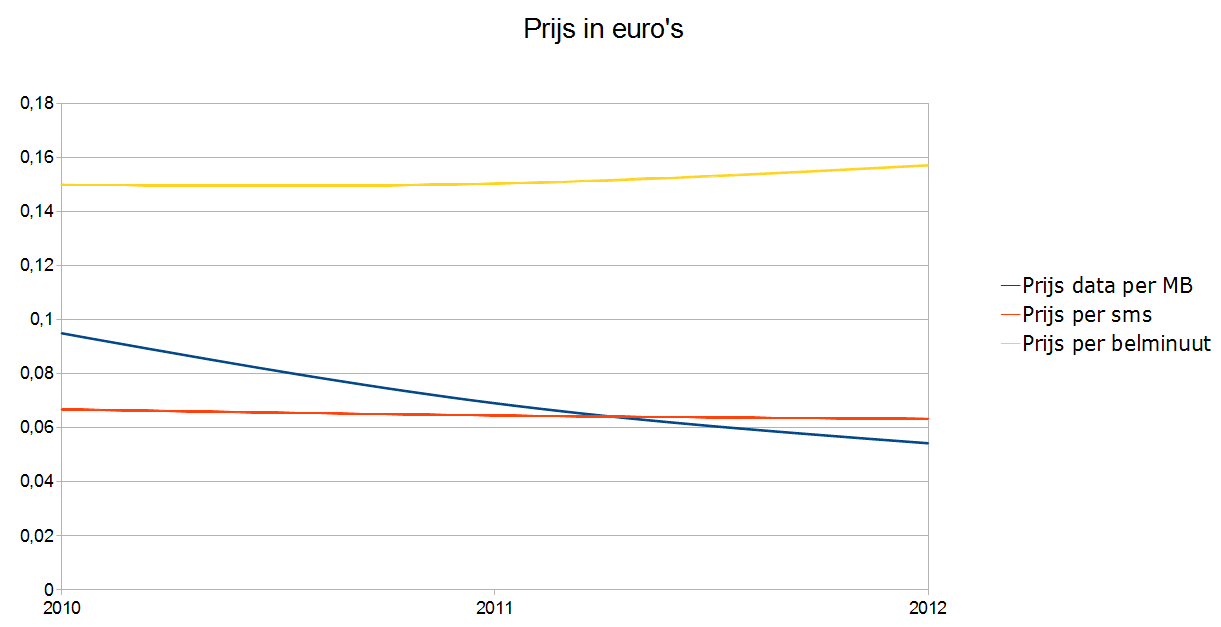 Het gebruik van mobiel internet wordt nog altijd goedkoper, ondanks dat providers datalimieten hebben ingesteld en de prijzen voor databundels hebben verhoogd. Kostte een MB aan data over mobiel internet in 2010 nog 9,4 cent, nu is dat gezakt tot 5,4 cent.