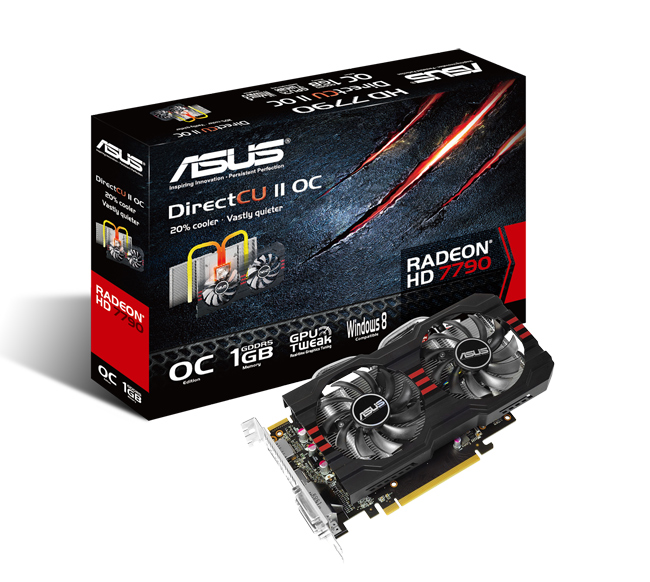 Fabrikanten Asus en PowerColor tot slot, zien blijkbaar geen brood in de standaard geklokte HD 7790's en brengen vooralsnog alleen vanuit de fabriek overgeklokte videokaarten uit. PowerColor komt met een versie met een enkele fan met een gpu-frequentie van 1030MHz. PowerColor's TurboDuo-variant, met dubbele fan, draait op 1075MHz. De geheugensnelheid is net als bij de standaard HD 7790 6000MHz effectief. Asus heeft de DirectCU II/OC nog een stukje sneller gemaakt; deze kaart draait stanaard op 1075MHz en heeft een geheugensnelheid van 6400MHz.