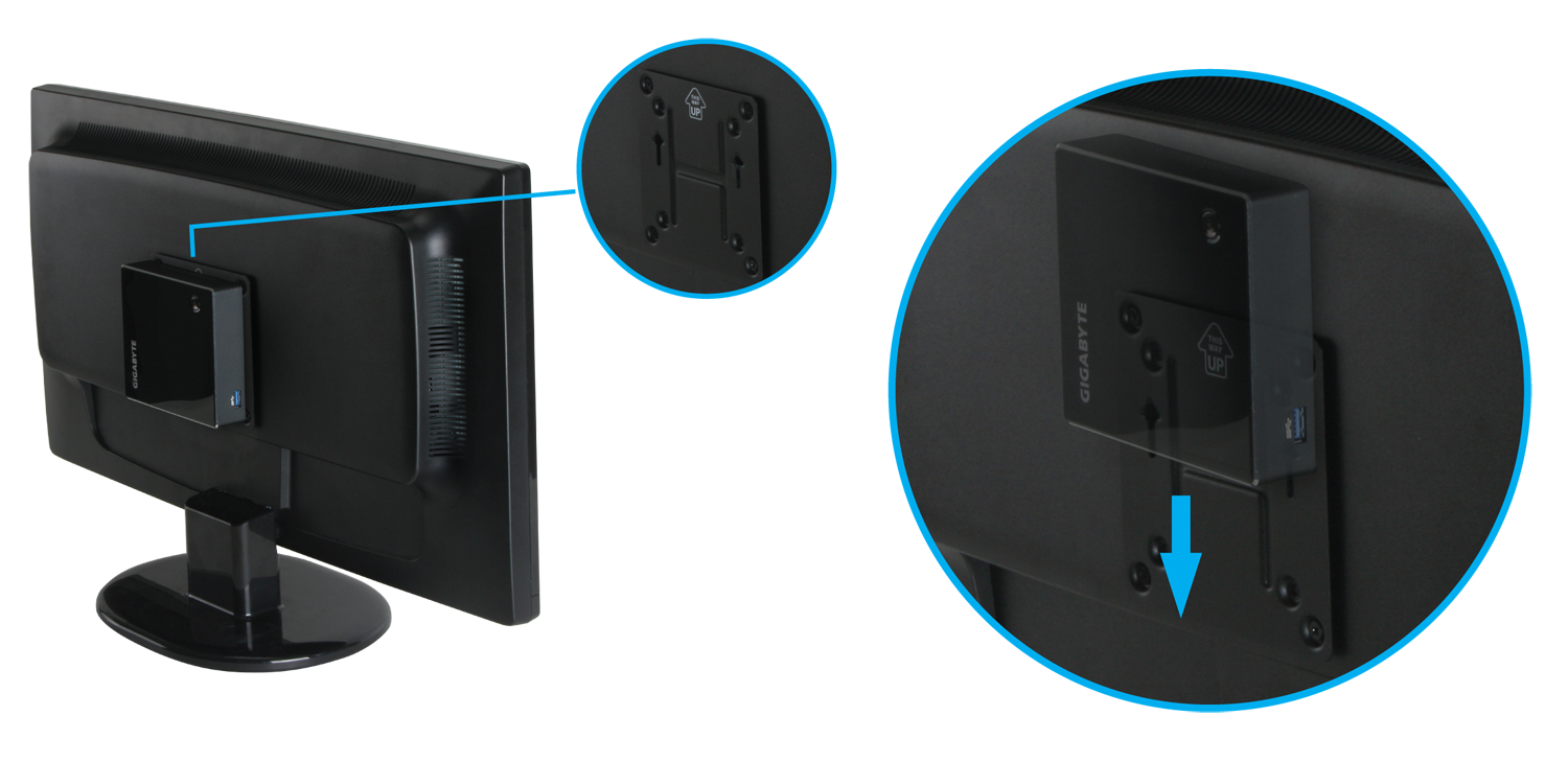 Gigabyte levert de Brix inclusief een pci-e-wifi-module, een stroomadapter en een vesa-mount die geschikt is voor de afmetingen 75x75 en 100x100mm, waarmee de mini-pc achter een tv of monitor geschroefd kan worden. De Brix zelf meet 29,9x107,6x114,4mm.