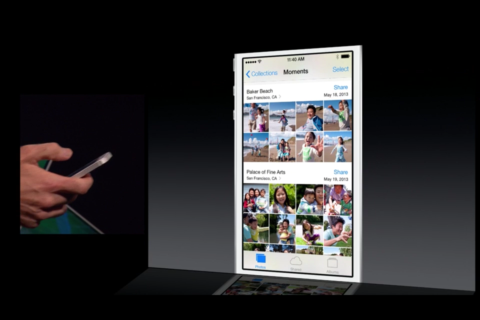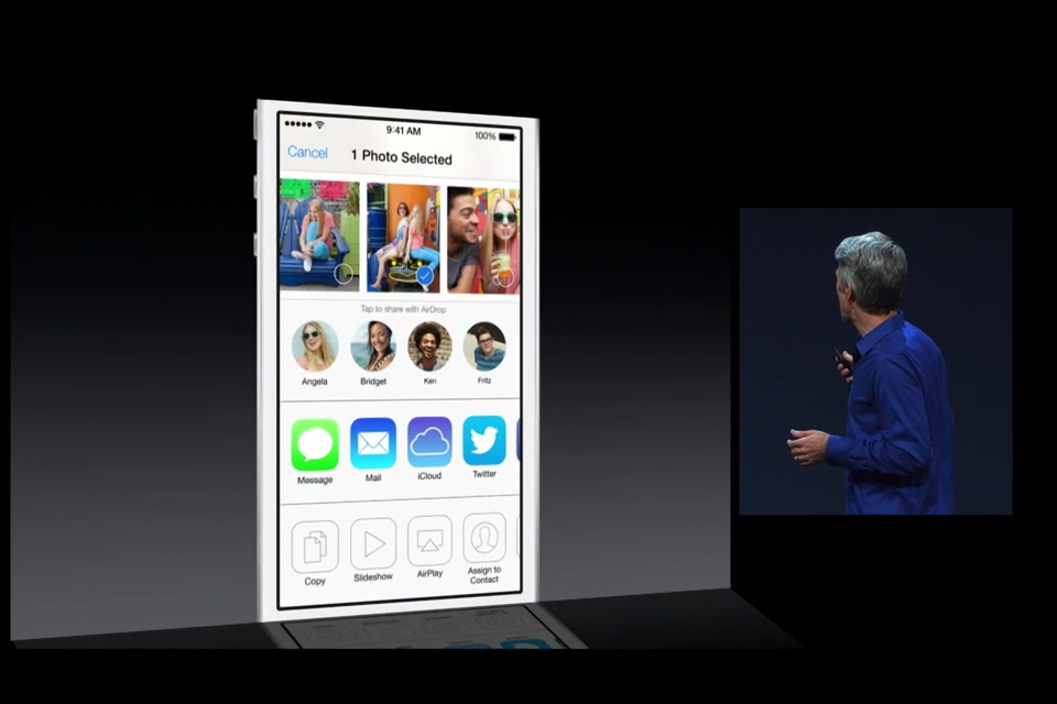 Naast het nieuwe ontwerp zijn er ook enkele nieuwe features aan toegevoegd. Een daarvan is AirDrop, een manier om bestanden te delen via wifi-direct. Die functie werkt alleen op de nieuwste hardware, waaronder de iPhone 5, iPad 4 en iPad Mini. Daarnaast heeft de camera een aantal fotofilters gekregen, net als veel populaire apps voor iOS zoals Instagram. De Foto's-applicatie heeft bovendien een nieuwe indeling gekregen aan de hand van 'Momenten', op basis van locatie en tijd.