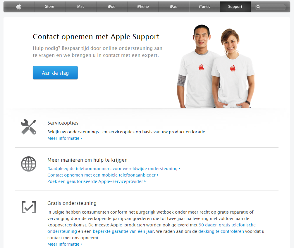Op zijn website meldt Apple nu echter expliciet: "In België hebben consumenten conform het Burgerlijk Wetboek onder meer recht op gratis reparatie of vervanging door de verkopende partij van goederen die tot twee jaar na levering niet voldoen aan de koopovereenkomst." De voorwaarden zijn verder uitgewerkt in een pdf-document. Ze gelden voor alle producten die de consument bij Apple of bij premium resellers koopt, waaronder ook niet-Apple producten.