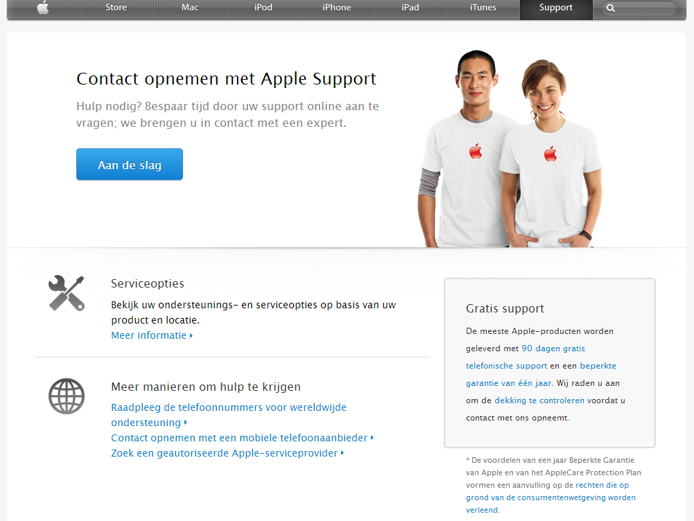 Voorheen stond op de pagina alleen te lezen: "De meeste Apple-producten worden geleverd met 90 dagen gratis telefonische support en een beperkte garantie van één jaar." Die garantie blijft Apple bieden voor zijn producten die via andere kanalen zijn gekocht en dit geldt dus ook als de koper zich niet tot de verkoper wendt.