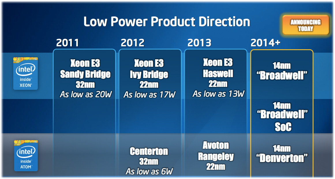 Verder maakte Intel bekend volgend jaar met 14nm-versies van zijn zuinige serverchips te komen. De Avoton-Atom wordt dan opgevolgd door Denverton. De huidige zuinige Xeon E3's worden op 22nm geproduceerd en zijn rond de Haswell-architectuur opgetrokken. Die zullen volgend jaar opvolgers krijgen die niet verrassenderwijs op de Broadwell-architectuur gebaseerd zullen worden. Wel verrassend is de komst van een Xeon-soc tegen die tijd. De verdere integratie op de chip, die net als de Atoms op het moederbord gesoldeerd wordt, moet verdere besparingen met zich mee brengen.
