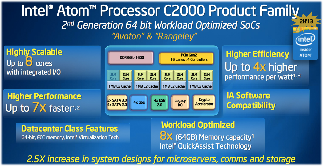 De nieuwe Atom beschikt over vier blokken met ieder twee Atom-cores op basis van de Silvermont-architectuur. Elk blok deelt 1MB L2-cache, waarmee het totale L2-cache 4MB bedraagt. De chips beschikken over vier pci-e 2.0-controllers en ondersteuning voor maximaal zestien pci-e 2.0-lanes. Verder is er ondersteuning voor twee sata 300-interfaces en vier gigabit-ethernetpoorten. Intel claimt dat de performance per watt vier keer hoger ligt ten opzichte van Centerton, terwijl er met 64GB acht keer meer geheugen ondersteund wordt.