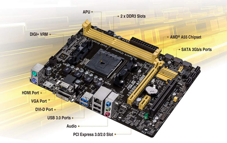 De A88X-chipset van AMD ondersteunt maximaal acht sata-600-aansluitingen en vier usb 3.0-poorten. Het door Asus aangekondigde A88XM-A-moederbord krijgt zes van de mogelijke acht sata-600-aansluitingen mee. Ook is er ondersteuning voor pci-express 3.0, maar daarvoor moet wel een Kaveri-apu gebruikt worden; bij oudere apu's is de gebruiker gebonden aan pci-express 2.0. Verder beschikt het moederbord over de gebruikelijke aansluitingen voor video en audio. Ook enkele verouderde aansluitingen zijn aanwezig, waaronder een d-sub-aansluiting, twee ps/2-poorten en een pci-slot.