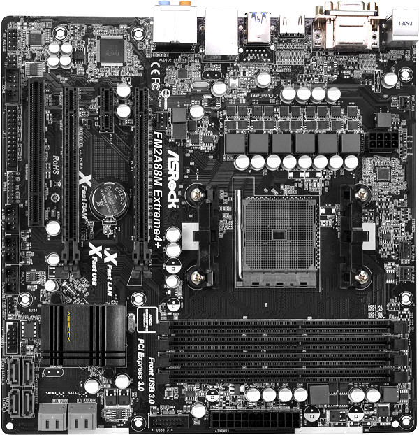 ASRock's FM2A88M Extreme4+ is de goedkopere mATX-versie van de Extreme6. Het moederbord beschikt over een pcie 3.0 x16-slot en een pcie 2.0 x16-slot, waarmee CrossFireX eveneens mogelijk is. Ook ondersteunt de Extreme4+ een maximale geheugensnelheid van ddr3-2600. Het moederbord beschikt over drie video-uitgangen, maar een video-ingang ontbreekt.