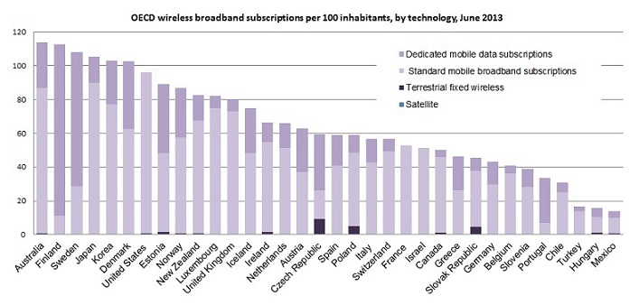 De OESO heeft ook cijfers vrijgegeven voor mobiel internet. Zo blijkt dat er inmiddels zes landen een penetratieniveau voor mobiel internet bestaat van 100 procent of meer. Het penetratieniveau wordt berekend als het aantal abonnementen voor mobiel internet op het aantal inwoners van het desbetreffende land. Nederland zit niet bij de landen met minimaal 100 procent penetratie; uit de data blijkt dat het percentage zelfs iets onder het OESO-gemiddelde van 68,4 procent.