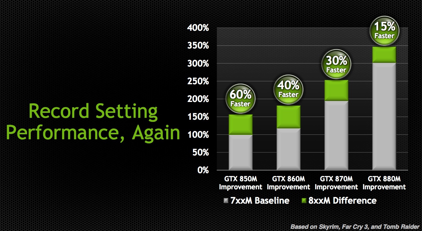 De gpu's beschikken hoe dan ook over betere specificaties dan vergelijkbare modellen uit de 700M-lijn voor het hogere segment, die Nvidia een jaar geleden uitbracht. Nvidia claimt dat de nieuwe gpu's 15 tot wel 60 procent beter presteren, waarbij het krachtigste model, de GTX 880M de minste winst oplevert met zijn hogere kloksnelheden en de GTX 850M de meeste met zijn nieuwe architectuur. Onder andere Asus, MSI, Dell Alienware en Lenovo komen met nieuwe laptops met de gpu's.