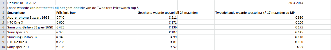 Tweaker Kiswum maakte de berekeningen voor de populairste toestellen uit de Pricewatch en drie soorten abonnementen: eentje met abonnementen met rond 250 belminuten en 500MB aan data, abo's met 90 belminuten en 2GB data en varianten met zoveel mogelijk onbeperkt gebruik. Anderhalf jaar geleden maakte hij ook al dergelijke berekeningen.