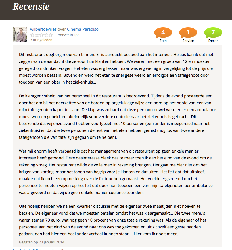 De recensie van de blogger, Caroline Doudet, kwam als vierde naar boven als op het gerecenseerde restaurant werd gezocht, schrijft BBC News. De titel van de recensie raadde bezoekers aan om het restaurant te mijden; dat was tegen het zere been van de eigenaar van het restaurant. Hij erkende dat er 'problemen' zijn geweest met de kwaliteit van het restaurant, maar volgens hem berokkende de hooggeplaatste recensie hem te veel schade.
