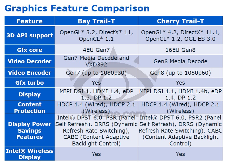 Cherry Trail wordt de eerste Atom die op 14nm wordt geproduceerd en de soc voor tablets en smartphones moet mede hierom aanzienlijke energiebesparingen brengen ten opzichte van de huidige 22nm-soc's van de Bay Trail-generatie. Tegelijkertijd moeten de prestaties bij het draaien van 3d-graphics verdubbeld worden, zo blijkt uit een slide die Intel tijdens IDF 2014 openbaarde. De claim is gebaseerd op een test van GFX Bench Egypt HD, ten opzichte van de resultaten van een Atom Z3775. Eerder werd al bekend dat de 8ste generatie gpu van Cherry Trail 16 execution units krijgen, tegen 4 voor de 7de generatie van Bay Trail