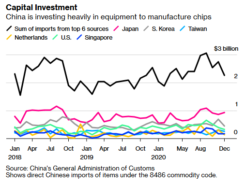 De productieapparatuur is afkomstig uit Japan, Zuid-Korea, Taiwan, Nederland en andere landen, schrijft Bloomberg. De machines zijn ingekocht door partijen als SMIC, een Chinese halfgeleiderfabrikant die onder andere werkt aan een 7nm-node. Volgens een rapport van SEMI was China in 2020 de grootste importeur van halfgeleiderproductiemachines.