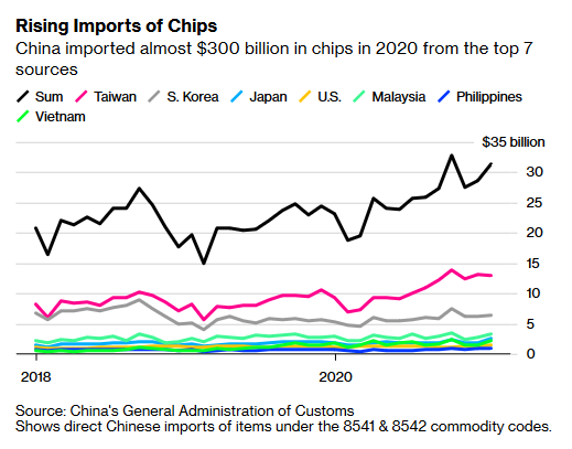 De import van losse chips door China is ook aanzienlijk gestegen in 2020. Chinese bedrijven zouden grootschalig computerchips hebben ingekocht om voorraden aan te leggen, voordat de sancties van de VS ingingen. Daarmee zou de import van computerchips door China zijn gestegen naar 'bijna 380 miljard dollar'. Dat is goed voor achttien procent van China's totale importuitgaven in 2020, claimt Bloomberg.