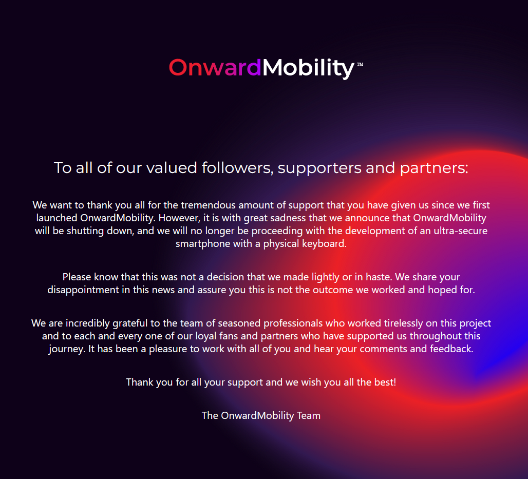 In een update op zijn website laat het Amerikaanse OnwardMobility weten dat het opdoeken van de start-up 'niet een beslissing was die makkelijk of gehaast genomen is', maar een reden voor het stopzetten van het werk aan de telefoon en het sluiten van het bedrijf geeft het niet. Verder wordt alleen bedankt voor de 'enorme hoeveelheid steun' die mensen hebben betuigd sinds het oprichten van het bedrijf en het starten van het project.