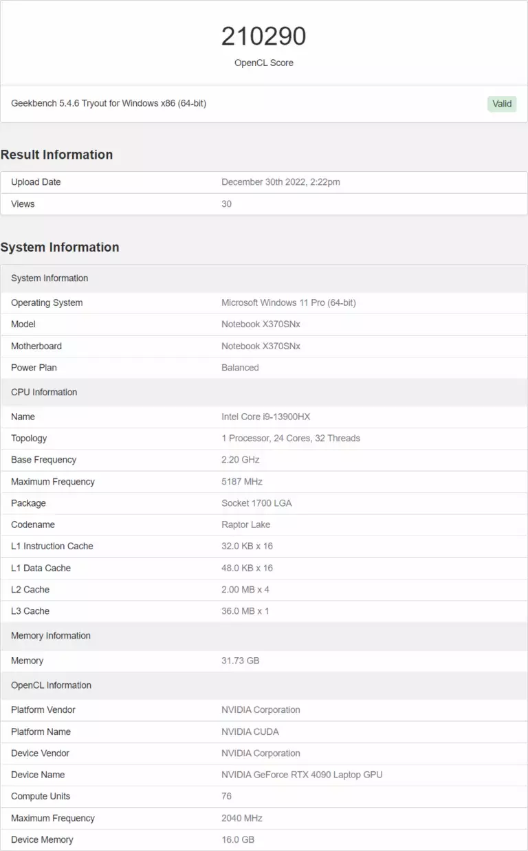 Het systeem met de mobiele variant van de RTX 4090 behaalde naar verluidt een OpenCL-score van 210.290 punten. De grafische kaart zat in een laptop met een Intel i9-13900HX-cpu en 32GB aan ddr5-ramgeheugen. De gpu heeft 16GB aan werkgeheugen en een boostklokfrequentie van 2,04GHz. Dat komt overeen met eerdere geruchten. De basisklokfrequentie zou op 1,59Ghz liggen.