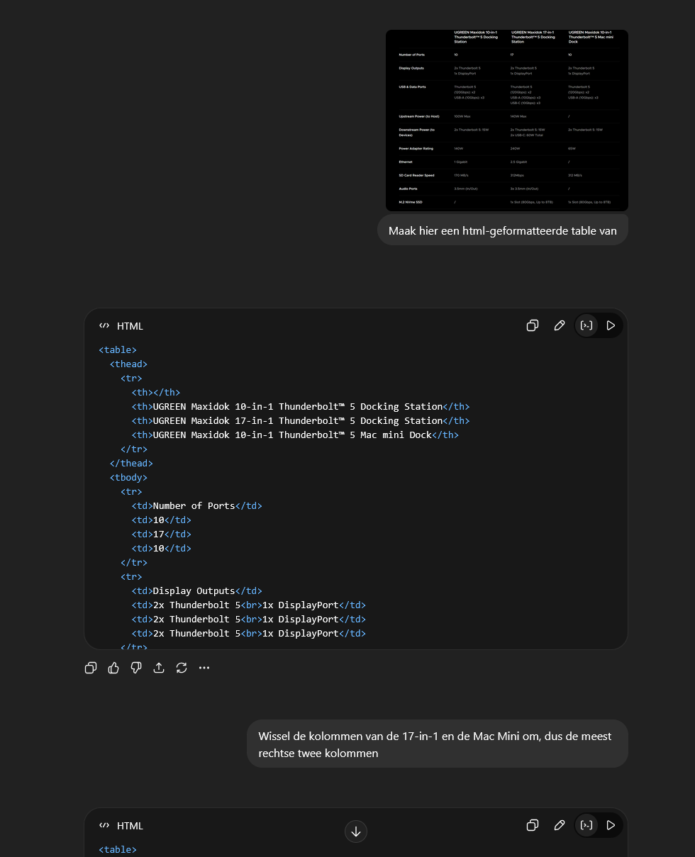 We zetten llm's verder ook wel eens in om specsheets of tabellen te maken. Dat kost vaak veel tijd (en is oersaai!), want je moet informatie van een pdf overtypen naar een tabel. Een screenshot uploaden en vragen daar een HTML-geformatteerde tabel van te maken, scheelt heel veel werk. We werken aan een prompt die ook Engelse termen zoals 'Battery' of 'Screen' automatisch vertaalt naar onze voorkeursvormen, Accu en Scherm, maar dat gaat nog veel mis en kost nog wat handwerk. Desondanks kan dit veel werk schelen. In de praktijk controleren we vaak wel of de tabel overeenkomt met de pdf, maar (en n is hier 1) dat gaat inmiddels heel vaak goed.