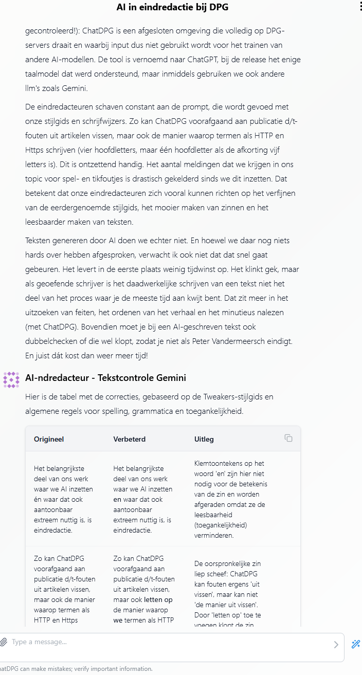 Het belangrijkste deel van ons werk waar we AI inzetten én waar dat ook aantoonbaar extreem nuttig is, is eindredactie. Al onze teksten gaan eerst door ChatDPG heen. Dat is geen typfout (kan ook niet, want ook deze tekst is gecontroleerd!): ChatDPG is een afgesloten omgeving die volledig op DPG-servers draait en waarbij input dus niet gebruikt wordt voor het trainen van andere AI-modellen. De tool is vernoemd naar ChatGPT, bij de release het enige taalmodel dat werd ondersteund, maar inmiddels gebruiken we ook andere llm's zoals Gemini.