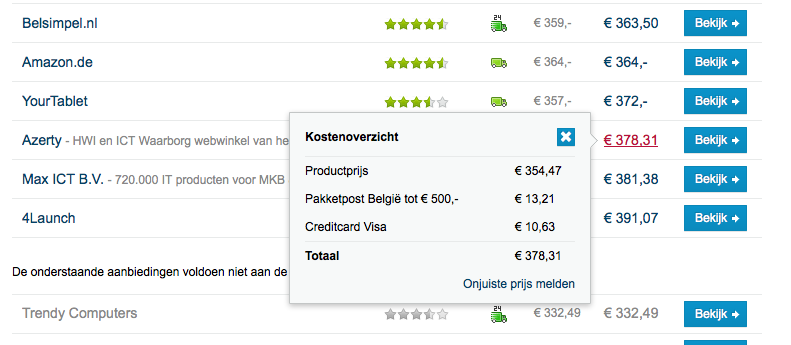 Uiteraard hebben we voor deze eerste testfase ook enkele andere voor de hand liggende zaken aangepakt met onze uitbreiding. Zo staan laptops met een azerty-toetsenbord in de Belgische prijsvergelijker bovenaan en worden vanzelfsprekend alleen producten getoond die door shops geleverd kunnen worden in België.
