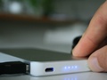 - Wanneer de accu aan staat, schijnen er 1, 2, 3 of 4 blauwe lampjes op de zijkant van de behuizing; om het accupercentage van 25%, 50%, 75% en 100% aan te geven. Dit licht is fel en schijnt door binnen de behuizing; het blauwe schijnsel komt langs de output USB-poorten naar buiten. Dit is niet storend, maar heeft wel met matige afwerking te maken.