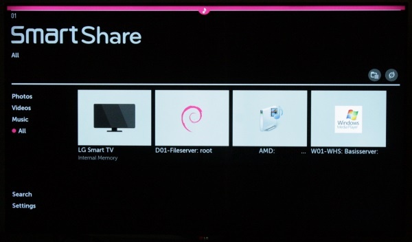 Het bladeren door mijn niet immens doch minstens indrukwekkend te noemen collectie materiaal viel de televisie zo nu en dan merkbaar zwaar. Je kunt ervoor kiezen om alle gevonden media ineens te laten zien, of bladeren door de op de server aanwezige mappen. Bij het terugnavigeren naar de bovenliggende map ben je de vorige scrollpositie kwijt en begint het overzicht weer bovenaan. Je kunt mediabronnen naar keuze in- en uitschakelen en ook de verschillende types content (video, audio, foto) laten zich eenvoudig filteren.