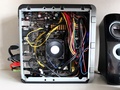 Inbouwen van een Mini-ITX moederbord gaat prima, wel wat gepriegel aangezien de voedingskabel redelijk kort is. De boxed CPU past er goed in, maar een andere cooler wordt i.v.m. de hoogte lastig vrees ik. De voeding bevindt zich voornamelijk extern via een 100~240V naar 19V adapter welke middels het bijgeleverde verloopstukje ook voor HP en DELL notebooks te gebruiken is. In de kast bevindt zich de printplaat met aansluiting voor de diverse voltages voor het moederbord.