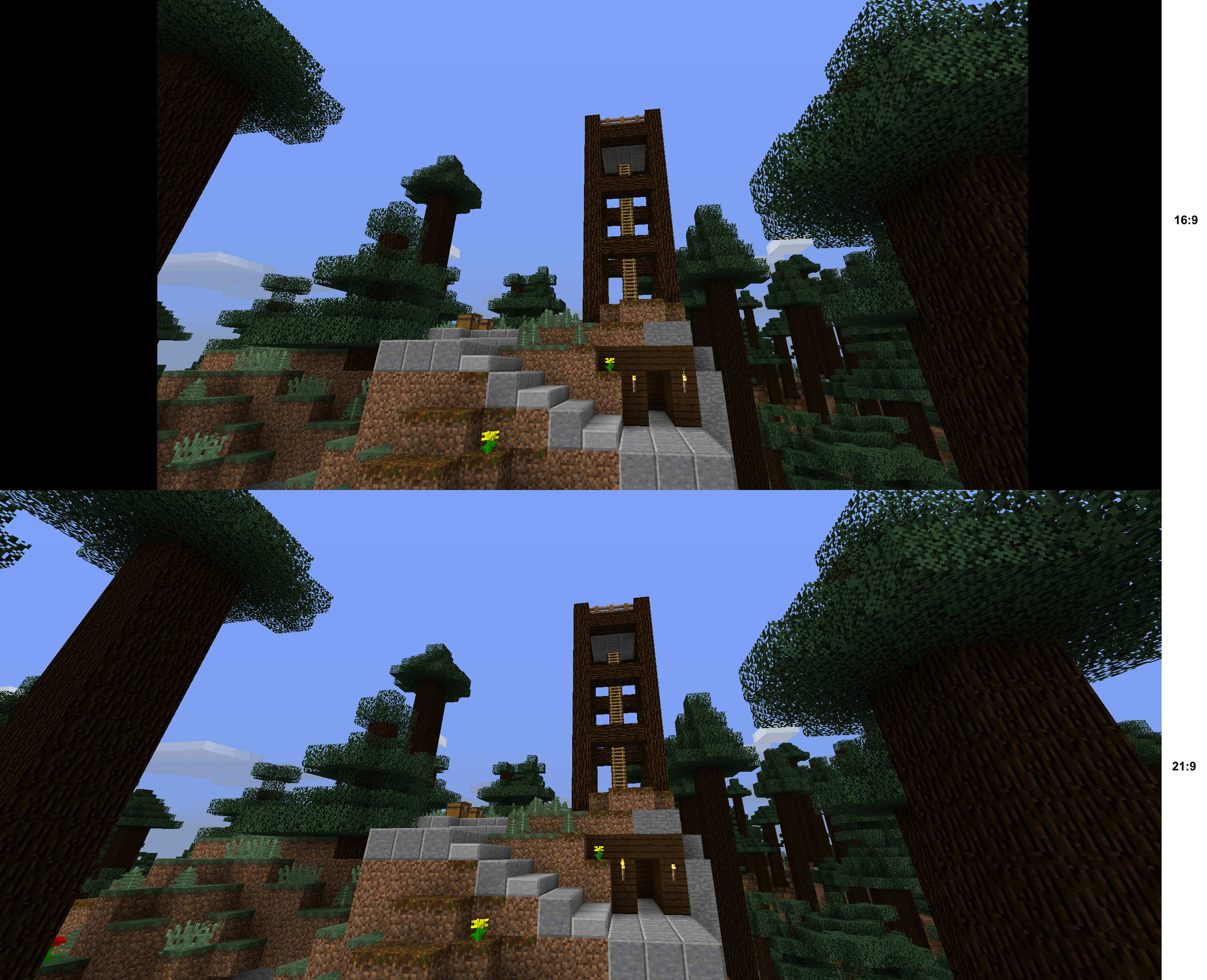 Ik speel zelf veel minecraft, ik heb 2x een screenshot gemaakt 1x op 1920*1080 en 1x op 2560*1080.