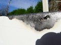 Een nieuw deksel kost €142,-, bijna een derde van een nieuwe machine. Dat kan altijd nog gekocht worden; nu loont een poging tot wat simpel carrosseriewerk nog wel. Ik had dat alleen veel eerder moeten doen want nu bleek er al een gat in het blik te zitten. Zie foto's. Gelukkig geen paniek, want het is geen dragend deel en met een oldtimer in een coronazomer heb ik zulk herstelwerk naar hartenlust kunnen oefenen.