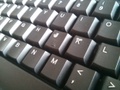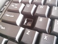 Kijk je echter van iets dichterbij dan zie je toch wel dat je hier aan de onderkant van de markt zit. geen hoge kwaliteit laser-edged toetsen. Nee, gewoon plastic vierkantjes met een stickertje erop en in het geval van mijn exemplaar lijkt het er wel op of er iets onder de sticker vastzit bij sommige toetsen zoals in deze foto duidelijk zichtbaar is onder de