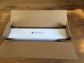 De MacBook komt in een bruine doos die door middel van een scheurstrip eenvoudig geopend kan worden. Geen schaar of mes nodig dus. In deze doos zit vervolgens de kenmerkende witte doos waarin de MacBook zit. Als je de flappen aan de korte zijden naar buiten drukt komt de binnenste doos omhoog zodat je deze makkelijk kunt pakken.