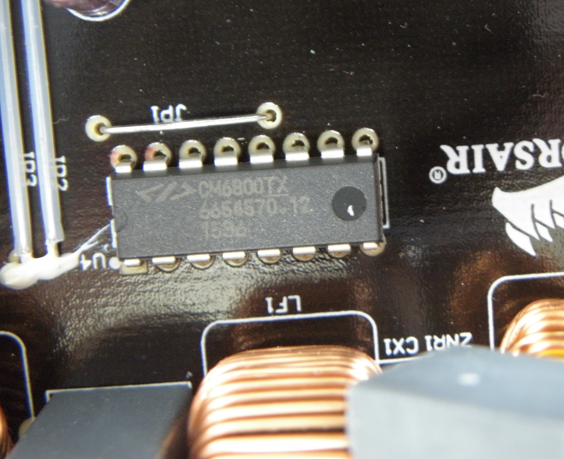 DE FAN De fan van de voeding is een belangrijk onderdeel. Zo moet de fan genoeg airflow bieden om de voeding koel te houden. Als de voeding namelijk te warm wordt kan dit negatieve gevolgen hebben op de prestatie van de voeding. En als er een onderdeel echt veel te warm wordt kan die zelfs stuk gaan, waarbij het mogelijk is dat er schade aan de PC ontstaat. Naast genoeg airflow is de kwaliteit van het lager ook belangrijk, dit bepaalt namelijk hoe lang de fan mee gaat. Een echt goed lager kan tientallen jaren mee, terwijl een slecht lager al na een paar jaar versleten kan zijn. Naast dat is er natuurlijk ook het verschil in geluid. Lagers zelf maken geluid, maar ook de fan en het rooster kunnen door luchtstromen geluid maken. ![]() De fan in de CX450M is een Hong Hua HA1225H12S-Z met sleeve bearing (glijlager) volgens Corsair. De Hong Hua HA1225H12S-Z kan echter ook een rifle bearing fan zijn, maar deze vinden we alleen terug in de Vengeance serie en niet in deze CXM serie. Sleeve bearing (glijlager) is het goedkoopste type lager en heeft ook de kortste levensduur, voor een voeding in deze prijscategorie is sleeve echter vrij normaal. Rifle bearing is een variant van sleeve, maar door de aanwezigheid van een spiraalvormige groef wordt het lager continue gesmeerd waardoor de levensduur aanzienlijk toeneemt en ook is het lager stiller. TOTAALBEELD INTERN Als eerste een plaatje van hoe de voeding er van binnen uitziet. Bij het openen van de voeding verlies je overigens de garantie, je hebt er daarnaast vaak ook niks aan en open de voeding ook zeker niet terwijl de stekker nog in het stopcontact zit! ![]() ![]() De CX450M maakt gebruik van een double forward design aan de primaire kant van de voeding en DC-DC aan de secondaire kant. Double forward is gebruikelijk aan voor een 80PLUS Bronze voeding en DC-DC wordt steeds populairder bij 80PLUS Bronze voedingen als opvolger van groep regulatie. Groep regulatie heeft als nadeel dat de spanningsregulatie een stuk minder is en ook zal zo'n voeding niet aan de C6 en C7 power states van Haswell en nieuwere Intel CPU's kunnen voldoen. Voedingen met DC-DC zoals deze Corsair CX450M heeft hier geen probleem mee. De oude CX(M) serie, zoals bijvoorbeeld de CX430M had nog wel groep regulatie en miste ook de ondersteuning voor de C6 en C7 power states. Deze nieuwe Corsair CX450M, CX550M en CX650M is overigens gebaseerd op de oude RM450, RM550 en RM650. Nu was de kritiek op deze voedingen echter erg groot, doordat de voedingen nogal erg duur waren voor de kwaliteit die je kreeg. Dat is met deze nieuwe CXM serie dus stukken beter doordat de kwaliteit in sommige opzichten iets verbeterd is, in sommigen ook iets verslechter trouwens, maar de prijs is bijna gehalveerd. Door de halvering van de prijs, is de prijs/kwaliteitsverhouding enorm omhoog gegaan, wat deze voedingen veel interessanter maakt dan de te dure RM serie. ![]() Onder het PCB bevind zich een hard stuk plastic ter bescherming tegen kortsluiting. Zo kan een uitstekend stukje metaal geen contact maken met de behuizing en kortsluiting veroorzaken. EMI FILTER De voeding begint altijd met een EMI filter. Dit is een belangrijk filter, het filtert namelijk storing die van buitenaf de voeding in wil komen weg. Maar het werkt ook andersom, eventuele storing die de voeding afgeeft wordt ook weggefilterd door het EMI filter. Bij goedkope voedingen wil hier nogal eens op bespaart worden, door het weglaten van enkele componenten. Een enkele keer, bij de meest grote wanproducten, wordt het EMI filter helemaal weggelaten, i.p.v. dat er een aantal componenten missen. Zoals je wel kan bedenken is dat erg onverstandig, aangezien het van allerhande storing en problemen kan veroorzaken. ![]() Het EMI filter begint zoals bij veel voedingen bij de AC plug met een groene X-condensator welke over de fase en nul staan en twee blauwe Y condensators welke over de fase/nul en ground staan. Via hier gaan de fase en nul die aan de dubbelpolige schakelaar erboven zijn verbonden. ] ![]() Vanaf die dubbelpolige schakelaar gaan de fase en nul naar het PCB wel nog via een ferrietring. Op het PCB gaat het EMI filter verder met een glaszekering verpakt in krimpkous, zodat als het glas mocht breken de hele voeding niet onder het glas zit. Dan hebben we nog een ringkern spoel, twee common mode smoorspoelen, twee X-condensators en twee Y-condensators. Tussen de ringkern spoel en common mode smoorspoel lijkt zich onder de X-condensator ook nog een MOV te verstoppen. En daarmee is het EMI filter compleet. PFC CIRCUIT Van het EMI filter gaan we naar het PFC. Het PFC circuit behoort net als het EMI filter tot de primaire kant van de voeding. Hier wordt de frequentie verhoogt tot de meest ideale waarde voor de transformator. Ook wordt er voor gezorgd dat de stroom en spanning zoveel mogelijk in fase lopen en dit alles met zo weinig mogelijk verlies om zo een relatief hoog rendement te kunnen halen. ![]() De bruggelijkrichter, ook wel diodebrug genoemd, zorgt er voor dat de wisselspanning wordt omgezet naar een pulserende gelijkspanning. De spanning wordt niet meer negatief, maar gaat steeds van de maximale waarde naar 0V zonder negatief te worden. Het type kan ik echter niet zien door de kit die over de naam zit. ![]() Van links naar rechts zie je hier de primaire condensator, daarnaast een groene NTC thermistor die de inschakelstroom beperkt, tegen de NTC thermistor aan zit een flinke diode en het zwarte vierkant is een ingepakte APFC spoel. ![]() De primaire condensator, ook wel hold-up condensator genoemd, is een Nippon Chemi-Con uit de KMR serie met een capaciteit van 180μF, een maximale spanning van 400V en een temperatuurrating van maximaal 105℃. Daarmee is de kwaliteit van de condensator prima in orde, maar de capaciteit is waarschijnlijk veel te laag om die minimale 17 milliseconde spanningsloos te kunnen overbruggen die de ATX specificatie voorschrijft. Mijn voorkeur had gegaan naar één met hogere capaciteit zodat de hold-up tim