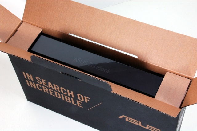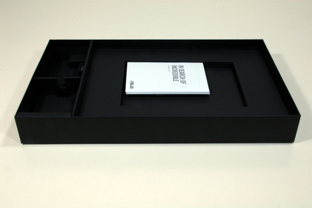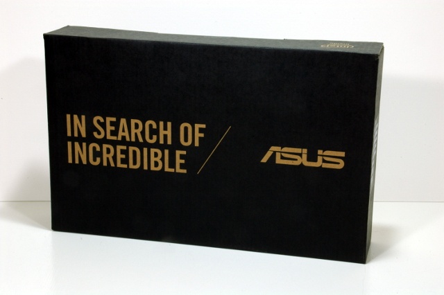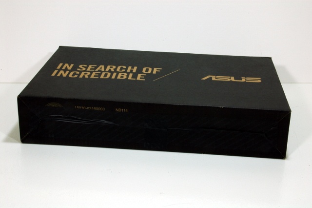 Het begin was nog binnen mijn verwachtingspatroon. Ik kreeg een zwarte kartonnen doos met 471 x 296 x 91 mm als uitwendige afmetingen in mijn handen. Asus, in search of the incredible in vette gouden letters op de flanken. Afgezien van de letters was de doos zwart, mooi minimalistisch. Het karton was niet overdreven dik. “Ik hoop maar dat dit voldoende beschermt”: was een gedachte waarop ik mijzelf betrapte. De doos om en om kantelend kwam ik op een van de zijflanken en op de achterkant een streepjescode tabel met Sales Order en Purchase Order nummer, Model nummer en Part nummer tegen. Op de achterkant ook een groot advies hoe de verpakking te behandelen.