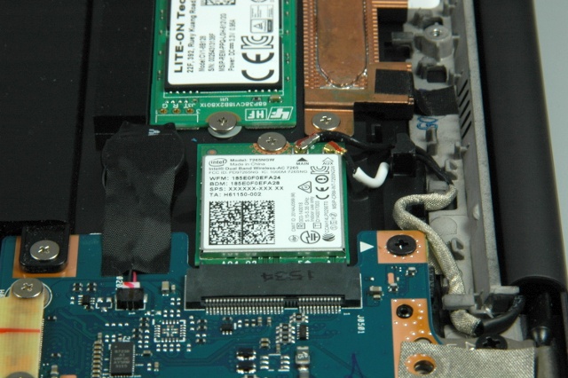 Rechts van het midden zie je een lange rechthoekig plak met een witte sticker. Dit is de M2-SSD LITE-ON CV1-8B128. Door aan het linker uiteinde een schroefje los te draaien is de SSD eenvoudig uit zijn slot te trekken en de vervangen. Weer rechts van de SSD zie je een kleinere vierkante plak, de netwerkkaart. Deze kaart is in een slot links gestoken en kan na het losdraaien van het schroefje rechts ook verwijderd worden.
