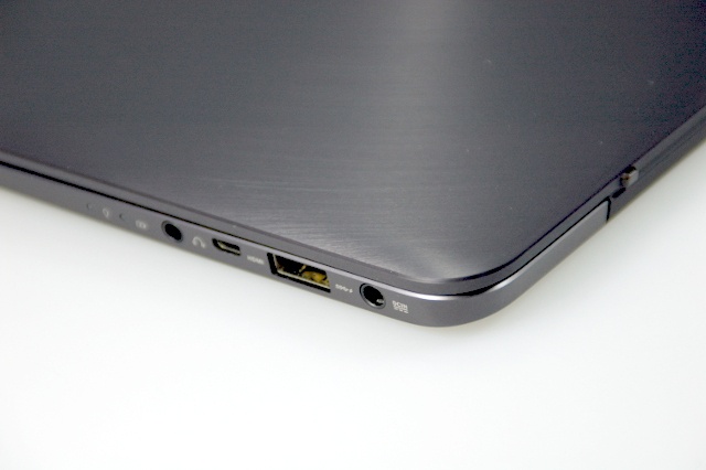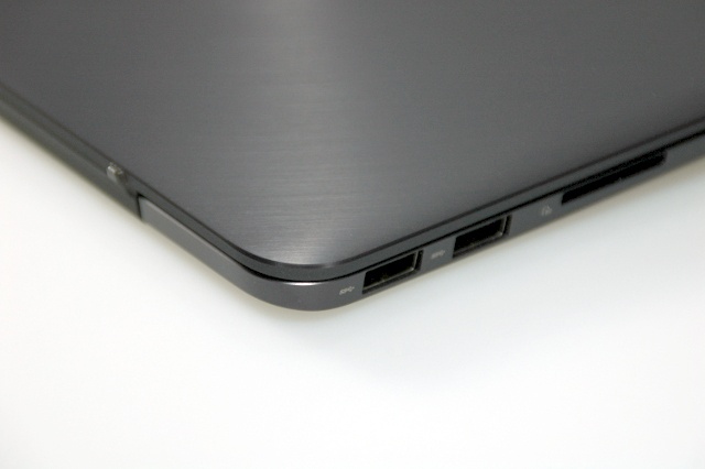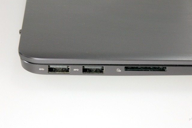 De linkerzijkant heeft wat minder poorten. Van voren naar achteren zijn aan deze zijde een SD-card reader en een tweetal USB 3.0 poorten te vinden.