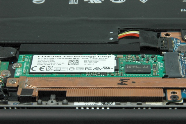 Bekijk je de foto’s van het inwendige van de laptop dan zijn er enkele blikvangers. Van voren gezien zie je links van het midden de Intel Core M3-6Y30 met daarop een overtuigende passieve koeler die via een platte heat pipe met een gedeelte met koelvingers verbonden is. De koelvingers bevinden zich voor het rooster dat zich aan de achterkant van de behuizing voor het scharnier bevindt. Wat mij aan dit rooster nog opvalt is dat het geen regelmatig gleuven patroon heeft. In die onregelmatigheid is geen patroon te herkennen. Dat de verdeling random is lijkt mij onwaarschijnlijk. Het patroon lijkt in een stromingsanalyse geoptimaliseerd te zijn. Of er is rekening gehouden met meerdere configuraties. Aan de passieve koeling lijkt dus aandacht te zijn besteed.