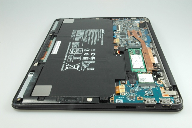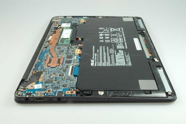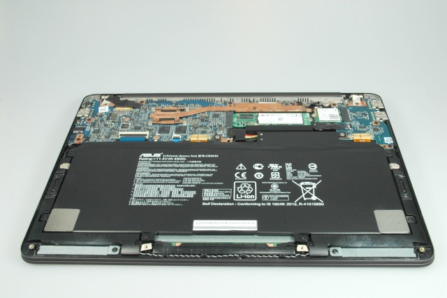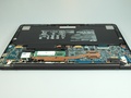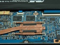 Tussen de processor en de accu zijn een tweetal IC’s voor het on-board geheugen te zien. Een nadeel van deze laptop is dat het geheugen on-board is en niet is uit te breiden. Zou je deze laptop willen kopen, denk dan goed over haar toepassing na. Dit on-board geheugen kan ook as een trade-off gezien worden voor de prijsstelling van dit complete product.