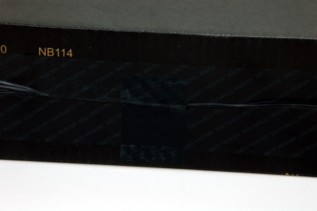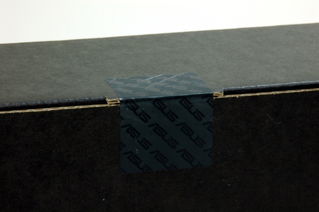 De doos was op twee punten met grijsverpakkingstape van Asus zelf afgeplakt. Het eerste stuk tape bevond zich over de ontgrendelflap, de tweede over het kruisverband op de bodem van de doos. De eerste had duidelijk de functie om af te sealen. De tweede had meer de functie om de dunne kartonnen doos voldoende samenhang te geven. Dit laatste is misschien mijn enige kritische puntje over de verpakking. Dit stuk tape komt op mij wat als een improvisatie over, al dient het dan pragmatisch zijn doel. Bij de kartonverpakkingsconstructeur zal deze tweede plakker een doorn in het oog zijn.