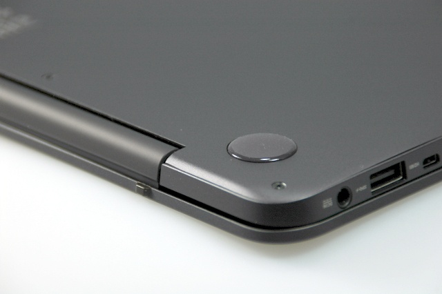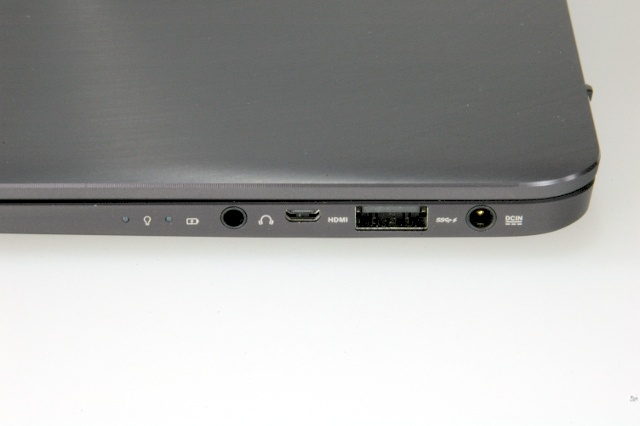 Aan de rechterzijkant van de laptop bevinden zich van voren naar achteren een aan-uit indicator, een batterij laad indicator, een 3.5 mm jack plug koptelefoonaansluiting, een micro HDMI-aansluiting, een USB 3.0 aansluiting en de voedingsaansluiting.