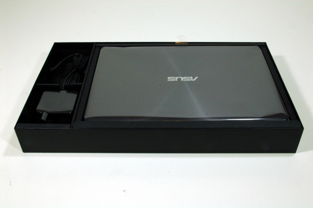 Met de binnendoos open blijkt dat je veel waar krijgt voor je geld. In eerste instantie zie je rechts de laptop zelf, terwijl links de voeding en de USB-ethernet adapter. In een kartonnen vouwwerk op hun plek worden gehouden. De laptop bevindt zich in een kunststof wikkel van dik kunststof. Deze wikkel is in staat om eventuele krassen met scherpe objecten te voorkomen.
